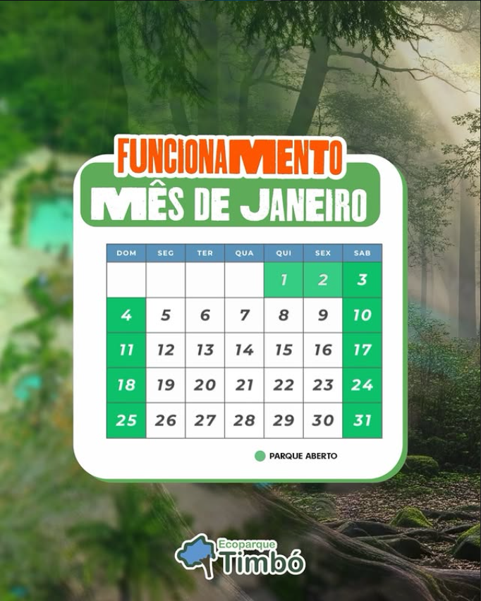 🌿✨ Funcionamento de Janeiro – Ecoparque Timbó ✨🌿 Janeiro é mês de contato com a natureza, descanso e muita diversão! 💚 🌳💦 👉 Chame a família, os amigos e venha aproveitar!